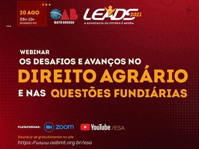 imgCom especialistas em Direito Agrário e Fundiário, o agronegócio entra em pauta na programação do II OAB Leads, com o webinário “Os desafios e avanços no direito agrário e nas questões fundiárias”. O evento será realizado nesta sexta-feira (20), das 8h às 12h, com transmissão pela plataforma Zoom e o canal do youtube da ESA-MT.