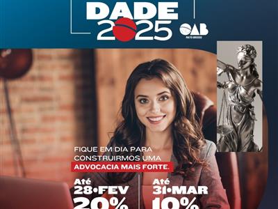 imgA Ordem dos Advogados do Brasil - Seccional Mato Grosso (OAB-MT) está disponibilizando descontos especiais para advogadas e advogados que pagarem a anuidade 2025 nos primeiros meses do ano, são 20% de desconto para quitação até 28 de fevereiro e 10% para pagamentos até 31 de março. Além disso, os jovens advogados e os advogados com mais 25 anos de inscrição têm valores reduzidos.